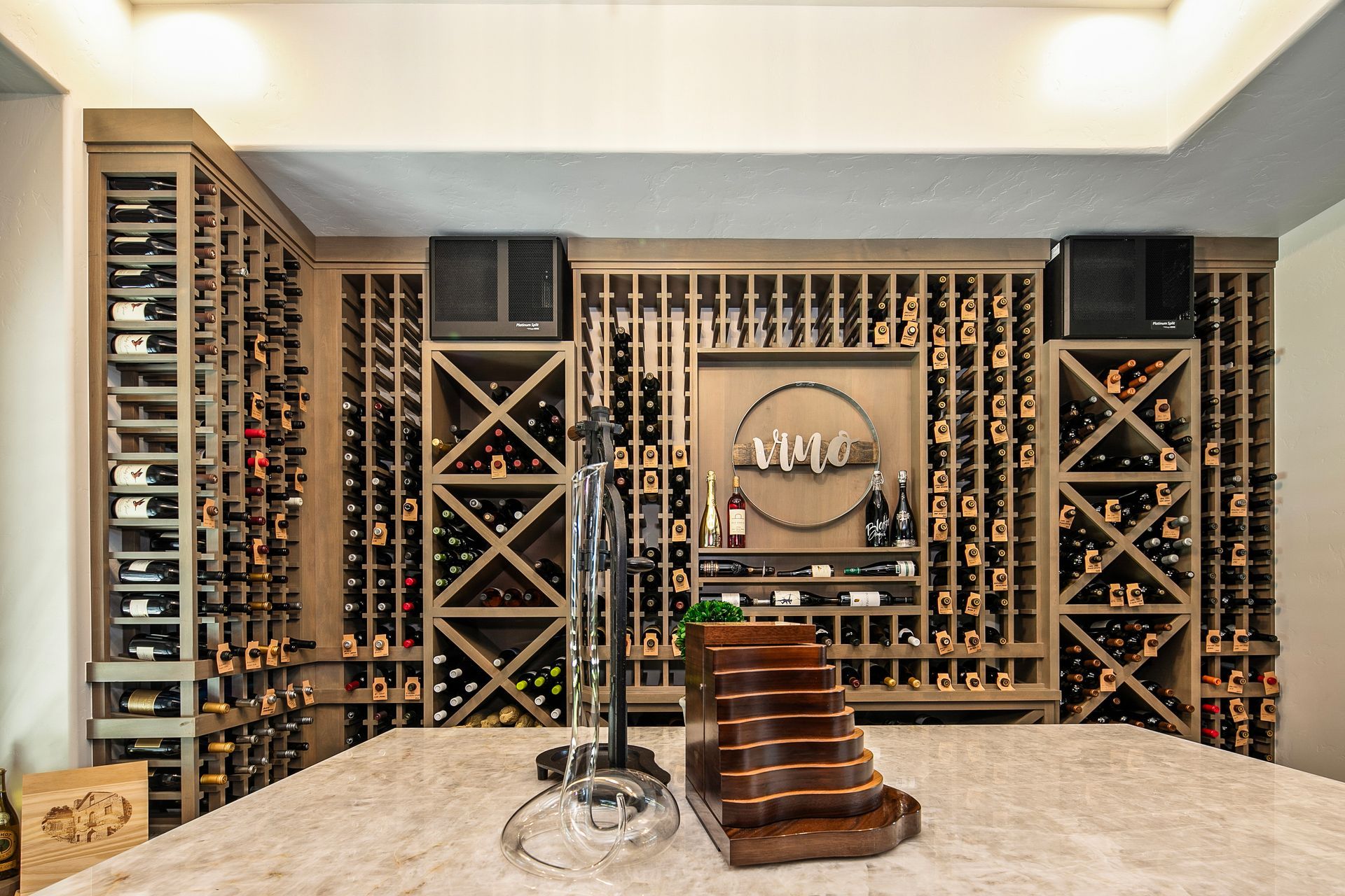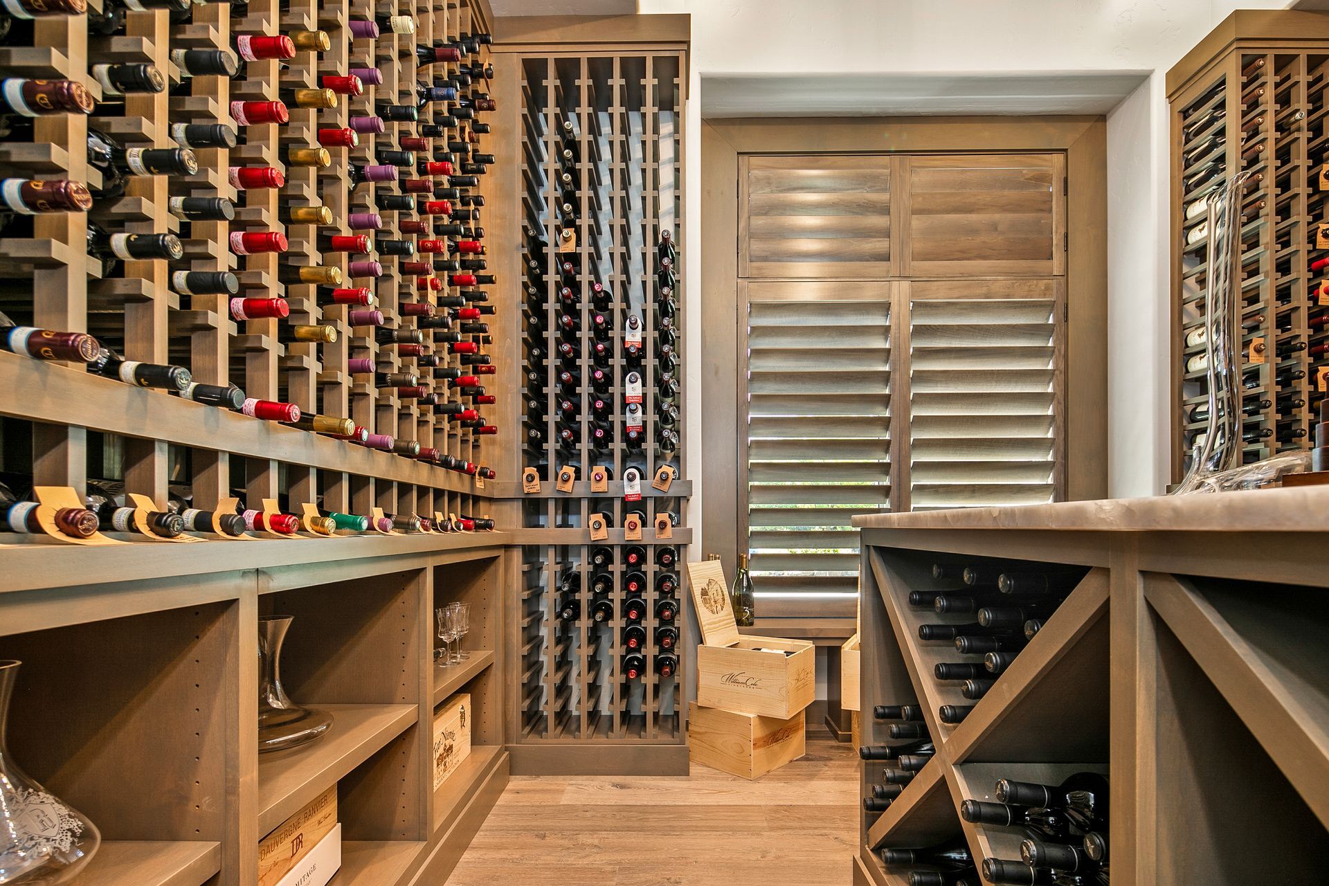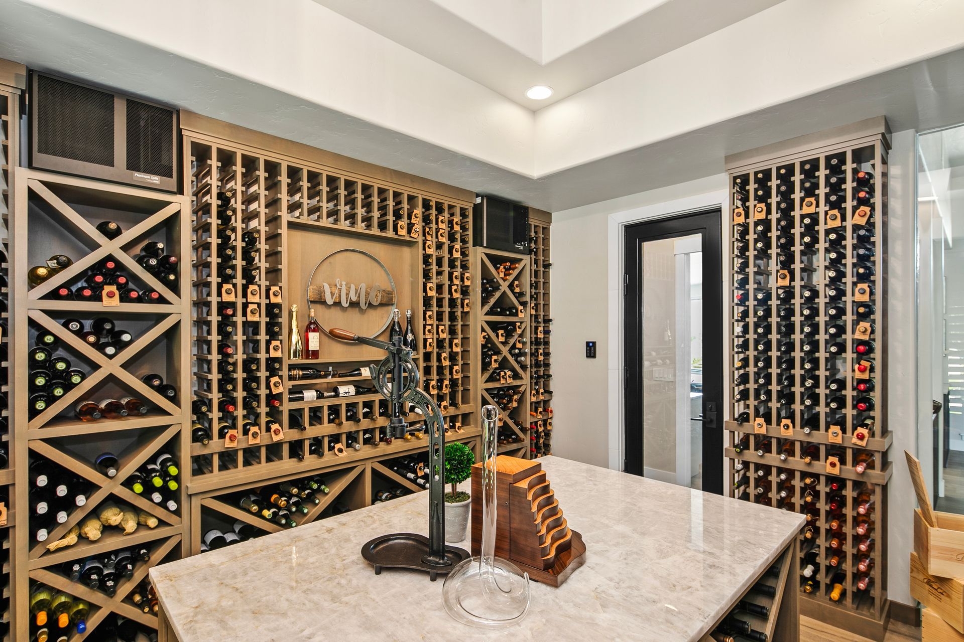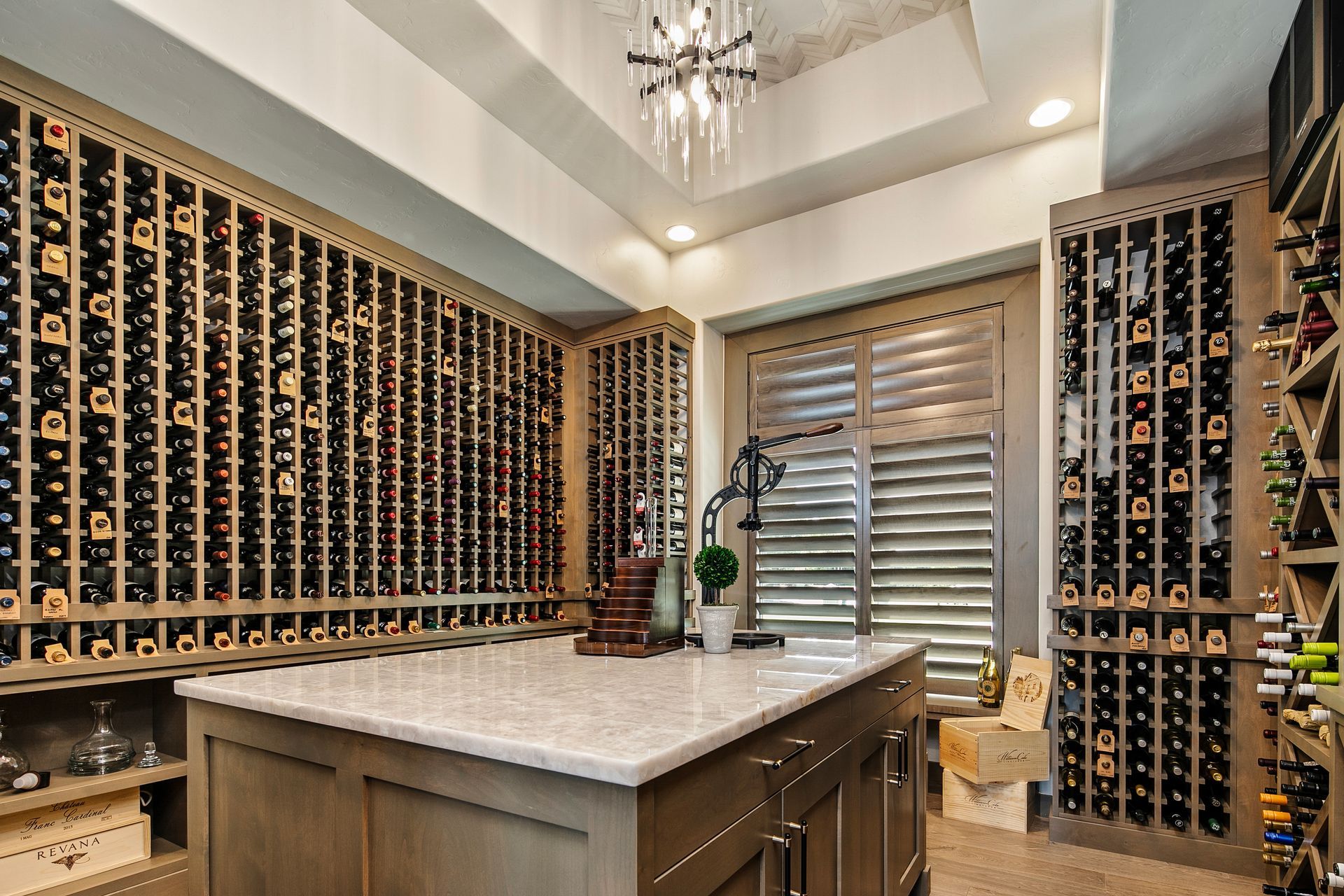 A wine room in a home is a dedicated space designed for the proper storage, display, and enjoyment of wine. Often climate-controlled to maintain ideal temperature and humidity, it blends functionality with elegance, showcasing carefully curated collections behind glass doors, in custom racks, or along statement walls. Whether it's a cozy nook or a luxurious cellar, a wine room adds sophistication and a personal touch to entertaining at home.